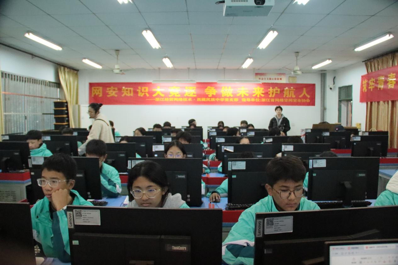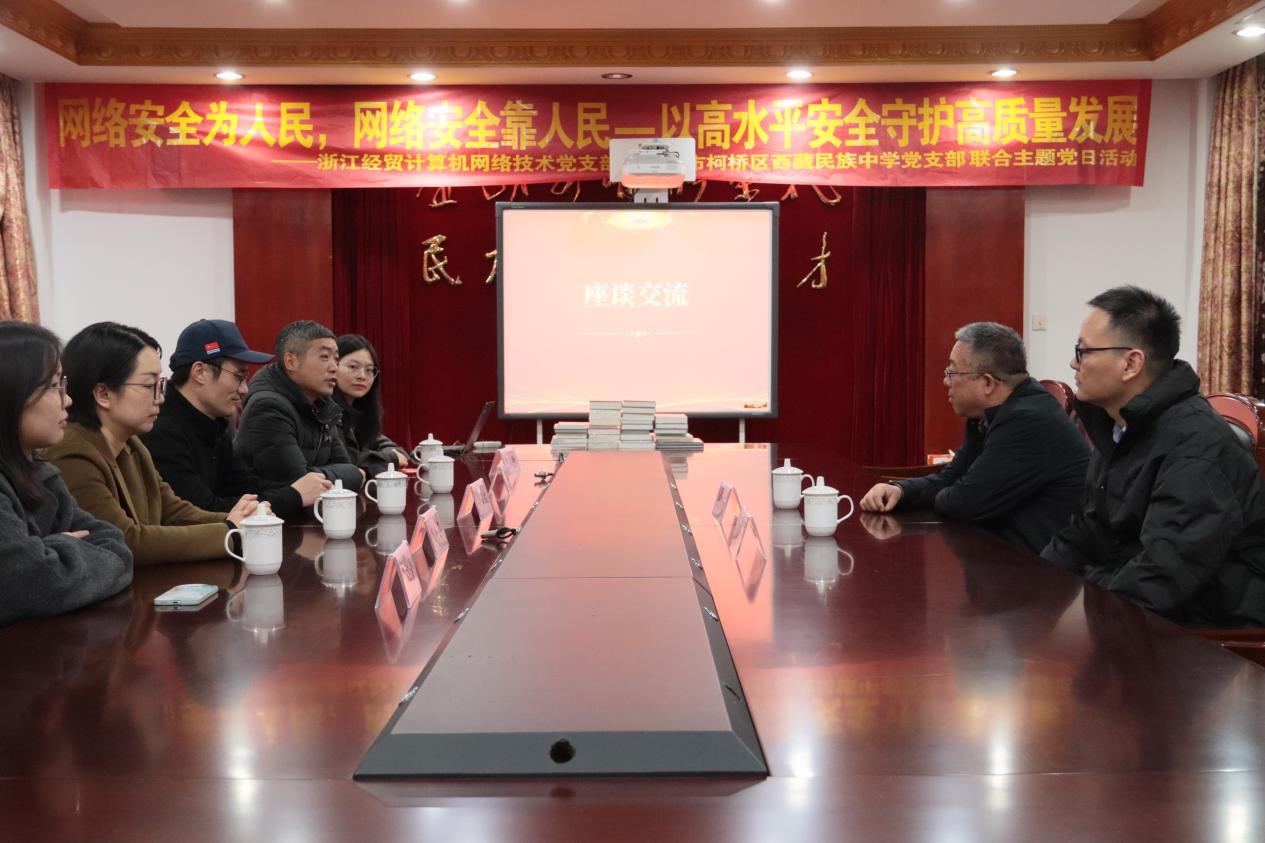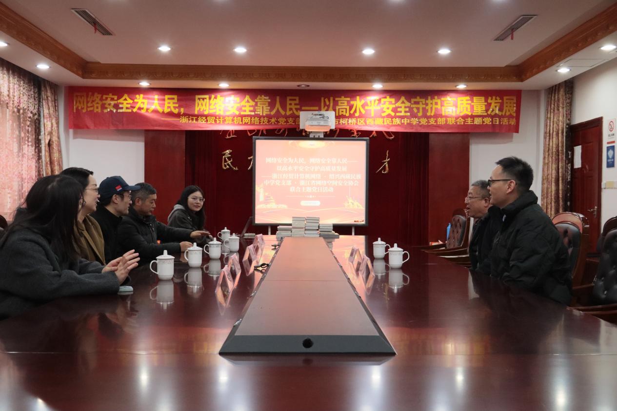 2025年12月2日下午,浙江经贸职业技术学院商务智能学院计算机网络技术党支部携手浙江省网络空间安全协会,走进绍兴市柯桥区西藏民族中学,联合开展“网络安全为人民,网络安全靠人民——以高水平安全守护高质量发展”主题党日活动。活动通过座谈交流、捐书仪式、校史馆参观、知识讲座、知识竞赛等形式,为民族中学师生带来了一场生动而深刻的网络安全教育课。